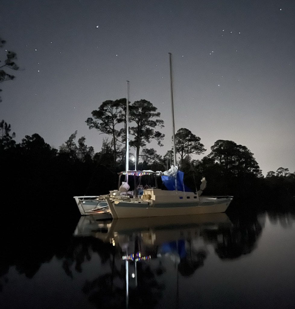 The number one reason many people choose to live on a small boat is simple: freedom. When your home floats and moves, the whole world becomes your backyard. You’re not tied to a piece of land, a lease agreement, or a neighborhood with a PIA-HOA. If you don’t like your view, your neighbors, or even the weather, you can weigh anchor and move. While I’ve remained in the same basic district for a while now, I often move my anchor around a half dozen or so places, all within a 15 mile radius. Although I must admit to spending more time in one particular bayou than others simply because it’s a hidden gem and almost impossible to see from the open bay areas. Only locals really know it for its protected waters, and most importantly the half dozen houses at one end are mostly holiday investment properties so they’re occupied infrequently, barely at all through winter.