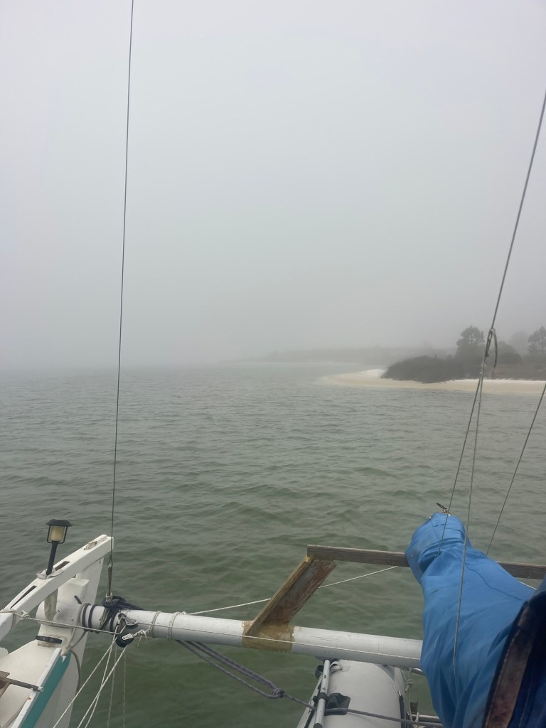 Take my current anchorage. I arrived sooner than planned because sitting at Navarre—wedged between condominiums and a busy bridge, wrapped in damp, clammy fog—wasn’t pleasant. Once I dropped the hook here, I was greeted by two or three days of dense fog, visibility down under a hundred feet, everything on deck soaked and dripping. When the fog finally lifted, it was followed by a couple of cold days with gusts up to 25 knots.